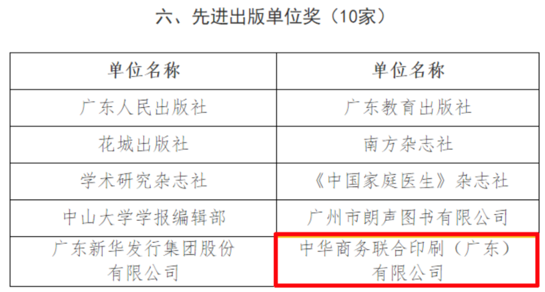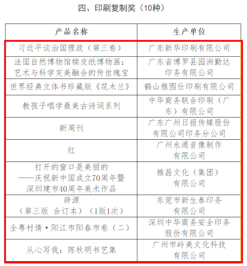 廣東出版政府獎參照中國出版政府獎設立了7個子項,包括:圖書獎、期刊獎、音像電子網絡出版物獎、印刷復制獎、裝幀設計獎、先進出版單位獎、優秀出版人物獎。其中獲獎的印刷企業及其作品如下圖所示: