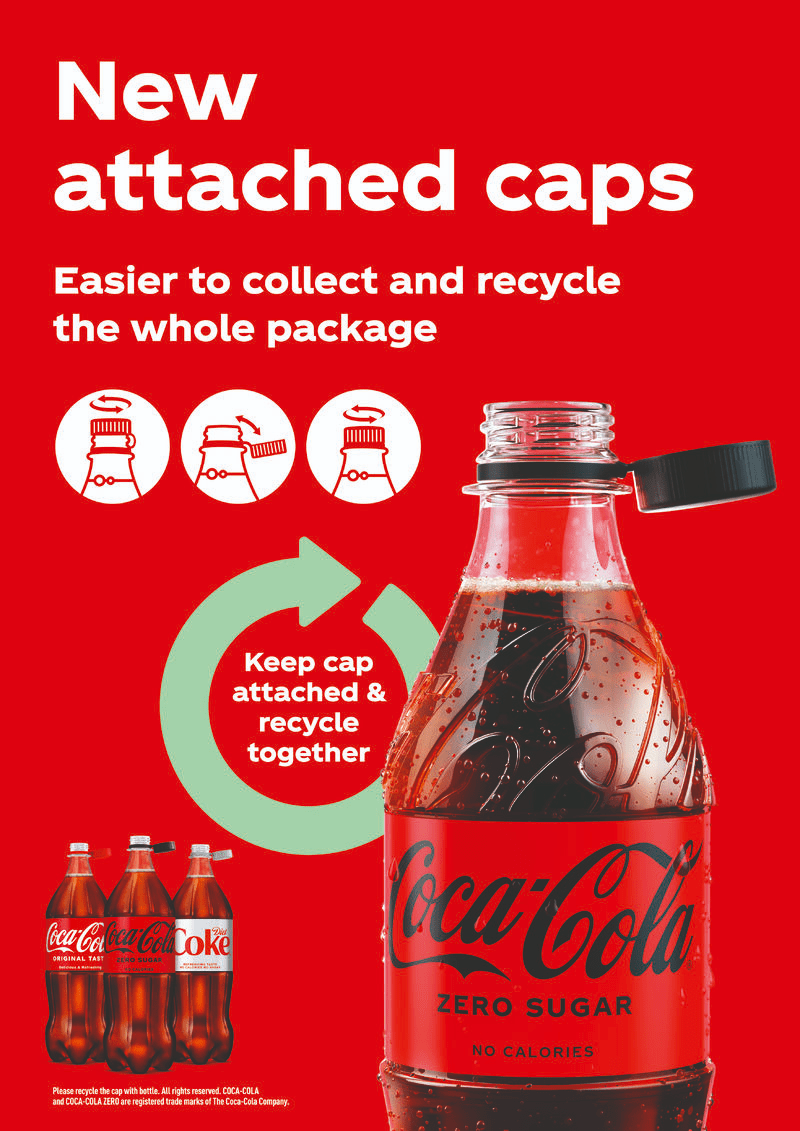 2022年可口可樂在英國推行了一款新包裝,該包裝為鉸鏈式瓶蓋,可以把碳酸飲料的瓶蓋栓在瓶身上。可口可樂表示這種設計或許能提升整瓶回收的概率,同時降低瓶蓋單獨被丟棄的可能性。