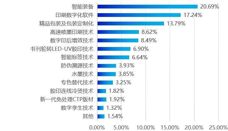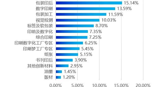 智能裝備(占比約20.7%)占據首位,印刷數字化軟件緊隨其后(占比約17.2%),精品包裝、高速噴墨和數字印后增效也有一定比例的關注度,可見對于企業的數智轉型和數字化領域的提質升級,是目前很多企業的主攻方向,也有很高的市場需求。