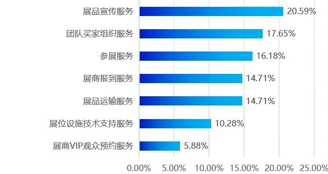 展商對于本屆全印展的各項展商服務,反饋也較為均衡,對于展品宣傳(20.6%)、團隊買家組織服務(17.65%)等都有一定的需求,展商對于全印展構建的供需雙方對接平臺有較高期待。