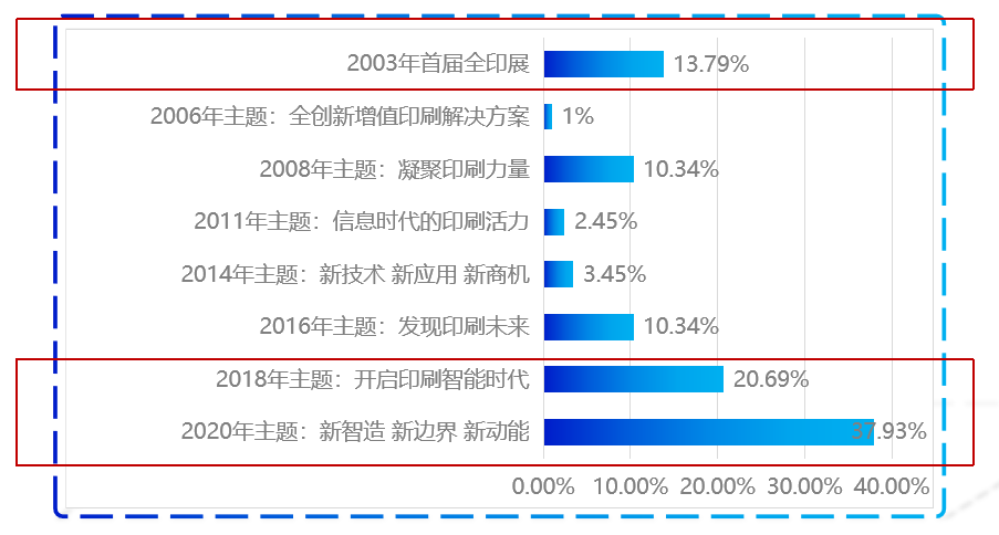 37.93%的受訪者對2020年全印展印象深刻,作為疫情第一年成功召開全球最大展,第八屆全印展無疑是為行業發展堅定了信心。20.69%的受訪者對2018年展會印象也很深刻,2018年,印刷業開啟了智能制造新時代,是行業轉型升級的重要節點。2003年是全印展的創辦之年,一度因為非典延期的全印展成為當年的黑馬,成為行業貿易對接的最重要平臺。