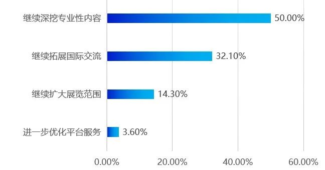約50%的受訪者期待全印展可以繼續深挖專業性內容,約32.1%的受訪者希望全印展進一步拓展國際交流。展出內容是展會核心,貿易對接是平臺功能價值體現,全印展也將從各方面繼續優化平臺。