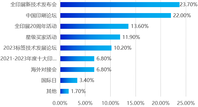 本屆全印展即將舉辦的精品同期活動當中,新技術發布會得到了最高的關注度(約23.7%),中國印刷論壇占比22%居于第二位,可見對于印刷發展趨勢以及創新技術應用是目前行業關注的熱點。