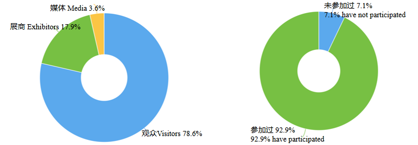 本次活動的受訪者中大多數為觀眾,占比約為78.6%,展商占比17.9%,媒體占比3.6%,約92.9%的受訪者表示曾經參加過全印展,約7.1%的受訪者目前還未參加過。