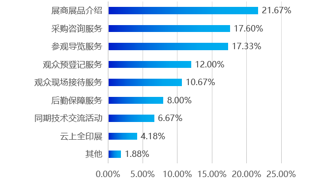 21.7%的受訪者對于本屆全印展的展品介紹服務最為關注,17.6%對于采購咨詢服務更關注,可見,供采對接始終是全印展觀眾最大的目標。