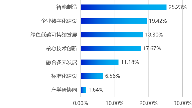 多數受訪者對于印刷行業發展趨勢的預測集中在智能制造(25.23%)、企業數字化建設(19.42%)、綠色低碳可持續發展(18.3%),智能制造無疑是行業最關注的新趨勢。