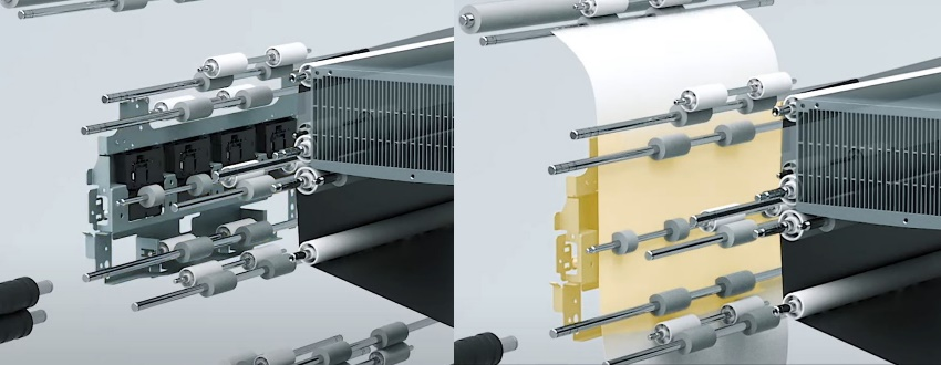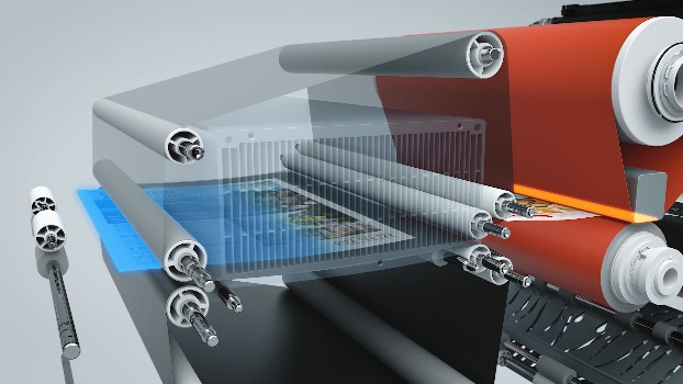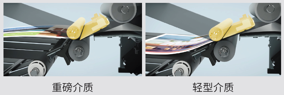 轉(zhuǎn)印過程中通過動態(tài)調(diào)整轉(zhuǎn)印內(nèi)輥和背壓板的位置來適應(yīng)薄紙和厚紙的印刷,即使在不同厚度的紙張上,也可以抑制轉(zhuǎn)印過程中的顏色不均勻和粘連,從而實現(xiàn)高品質(zhì)印刷。