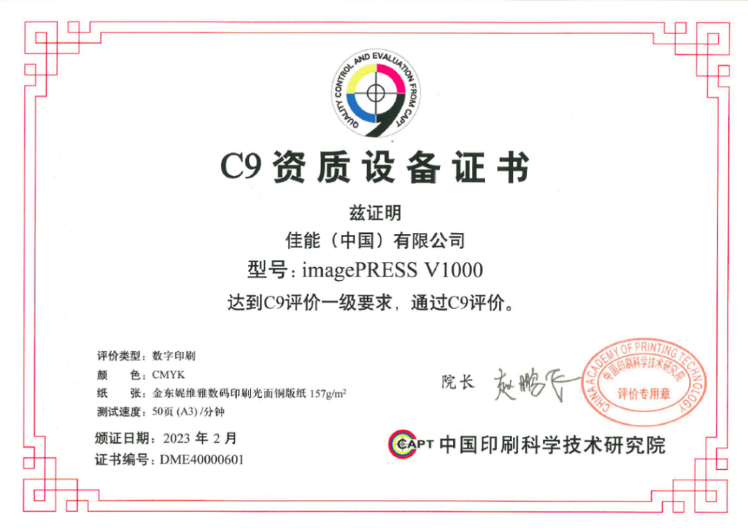 由于加持了佳能多種先進的技術(shù),佳能imagePRESS V1000成功通過了國內(nèi)權(quán)威的認證機構(gòu)——中國印刷科學技術(shù)研究院的嚴格測評,達到C9資質(zhì)設(shè)備最高的一級評價標準。C9評價項目涵蓋了對印刷品質(zhì)和穩(wěn)定性評測的多個方面:PDF/X解析輸出、色彩準確性、連續(xù)輸出顏色的一致性、短周期和長周期色彩穩(wěn)定性、印刷色彩均勻性、小文字、印跡耐摩擦性、正反面套準、四色套準、耐光性、樣張外觀、光澤度和印刷品分辨率等共計13個項目。這份證書充分證明了佳能imagePRESS V1000的實力。