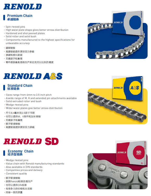作為世界上套筒滾子鏈的發明者和世界傳動鏈條行業的領導者,雷諾德一直致力于耐磨損性、抗疲勞性及卓越使用壽命的鏈條產品的生產和研發,受到世界眾多國家消費者的一致好評和認可。