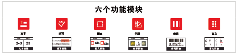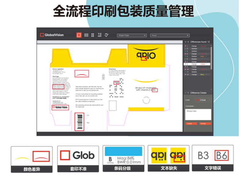 GVD首張校驗、印品檢測系統:可對印刷的實物印張或打樣樣張等實物印品上的文字、圖文、條碼、色彩、盲文和拼寫進行校驗,保證這些內容與品牌商的標準文件一致;可檢測標簽、紙盒、傳單、樣張、印張、改版、原圖、拼版、排版等實物印品上的錯誤和差異,并對這些差異進行判斷和處理;印品校驗廣泛適合印刷包裝企業,制版公司,品牌商等。