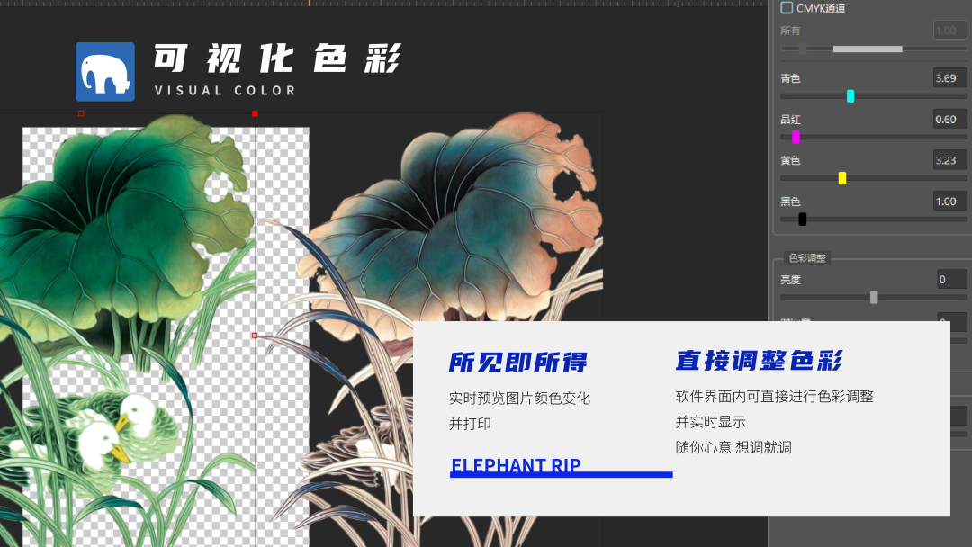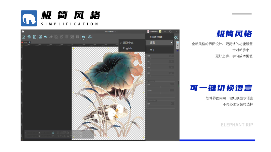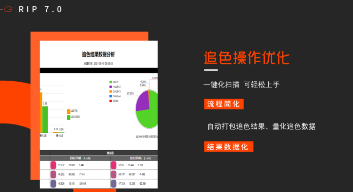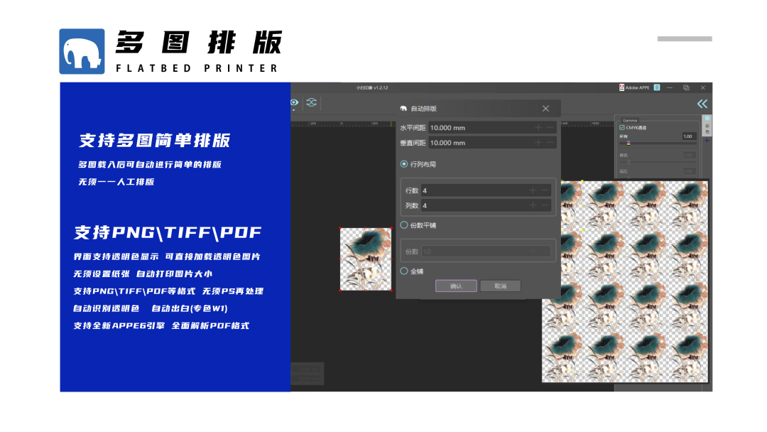 簡潔智能化的圖像排版與后道工序處理模塊,在印花和噴繪等行業應用中優勢明顯,可大大縮減前端拼版時間,提升效率;多種噴墨網點算法按需配置,極力呈現優秀的打印品質;自研色彩算法,以國標水平滿足生產需要,并帶有多項自由調節偏好,增強多介質的色彩表現;全新智能追色引擎,保證多臺設備間協同生產一致性;64位分段式RIP為無限幅面高效穩定工作保駕護航;解釋器采用全球頂級ADOBE APPE,在RIP應用中為國內唯一授權合作,既能體現更好的色彩、數據還原又能保證圖像文件完整性。