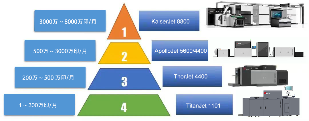 此次全印展天科威KaiserJET 凱智8800及TitanJET 1101解決方案的推出,搭配公司現有產品ApolloJet 5600/4400連續紙系列和ThorJet 4400單張紙系列噴墨印刷系統,一起構建了天科威數字印刷解決方案的四層金字塔布局,以更為完善的產品體系,滿足商業印刷、報業出版、政府文印、圖文快印等不同行業用戶的使用需求。